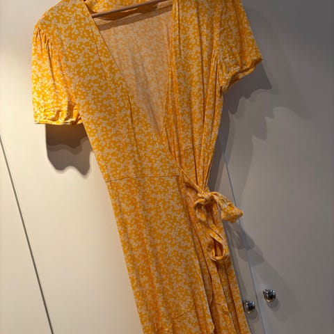 Pent brukt sommerkjole i blomstrete mønster (gule roser) selges. Har lommer og glidelåslukking på rygg.