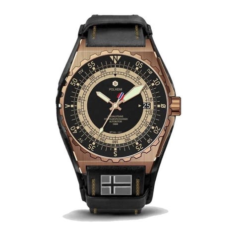Når du åpner etuiet vil du finne POLHEIM på den originale reimen. Vi har også lagt ved bund-delen samt et garantikort. Bronse er en høyst "levende" metall-legering og er umulig å holde helt blank. Derfor vil du mest trolig se at både kasse og spenne allerede har begynt å anløpe. Hvis du ønsker å få den helt 100% blank anbefaler vi faktisk å bruke sølvpuss. Klokken er utstyrt med et Sellita SW200-1 med standard justering og kan ha en +- 15-20 sek avvik per døgn. Erfaringsvis vil det største avviket være i de 2-3 første månedene. Det er ikke uvanlig at standardjustering stort sett holder seg under +-10 sek. Husk at det er skrudd krone på denne klokken og den må alltid være tilskrudd etter eventuell justering.