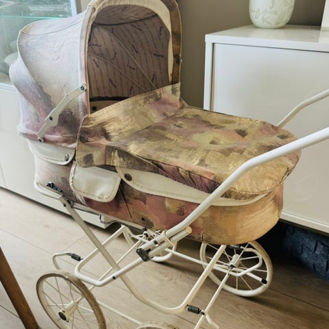 30 år gammel Simo dukke vogn, med regntrekk og handle nett.