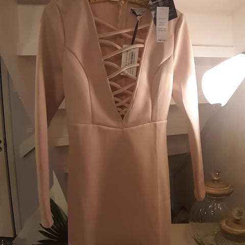 Nr 9: Kort kjole, Floyd, str 10 (M/38). Gammelrosa med blonder. Perler og paljetter i midjen. Vaffelsøm i ryggen. Brukt én gang.