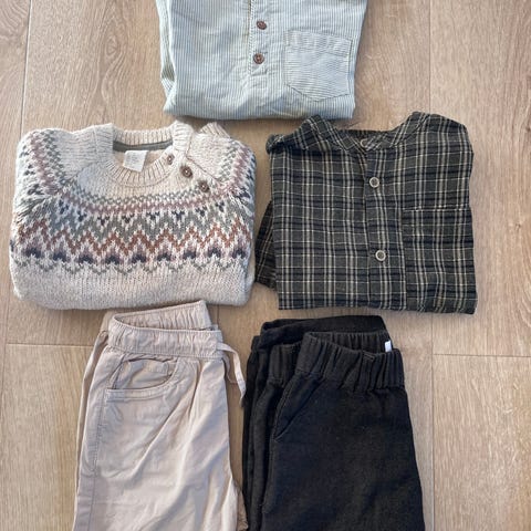 Klespakke bestående av 4 plagg selges samlet. En mørkblå dressbukse str 152, en lyseblå skjorte med lange armer str 146, en lys grønn skjorte med korte armer str 146 og en lys grønn genser str 150. Alt er pent brukt. Det er en merknad på ermet på genseren hvor den er sydd feil. (Se bilde).