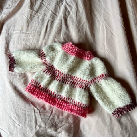 Fin og myk hjemmestrikket jakke i Sandnes garn i str 56 (1-2mnder). Pent brukt!
