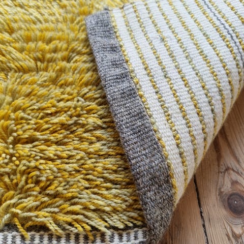 Håndknytta rye i ull. Utrolig fint spill i fargene og tett og fin i veven.