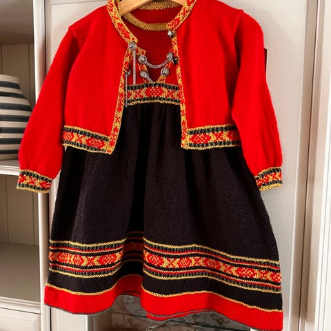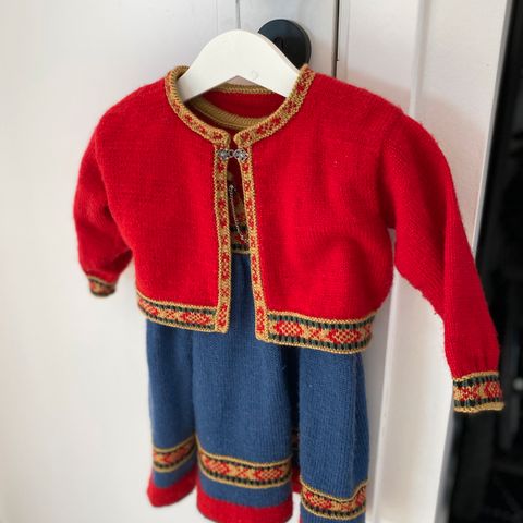 Kjempesøt strikket festdrakt i tre deler, klassisk rød og naturfarger/hvit ull. Fikk av mamma og er usikker på størrelsen, men tipper rundt 6-8 år.