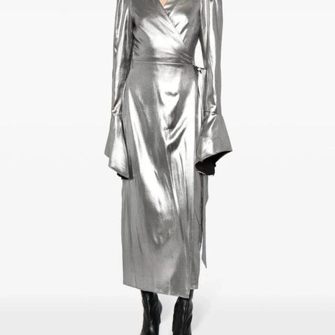 Ganni kjole i sølv, størrelse XS. Laget av et skinnende materiale som gir et elegant preg. Passer perfekt til spesielle anledninger. Helt ny. Ny pris 3500,-