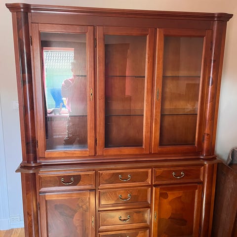 2 underskap og 1 overskap med skråkuttet glass i dørene. Det er belysning i overskap.