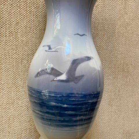 Selger min nydelige vase i klassisk blåhvit porselen fra Royal Copenhagen Made in Denmark. Vakkert nyperose motiv og en sommerfugl på baksiden. Mål H 14,5 cm og dia 16,5 cm. Hel, pen og blank, ingen skader, minimale bruksspor. Fremstår nær som ny. Pris kr 300,- Hentes i Oslo eller sendes etter avtale.