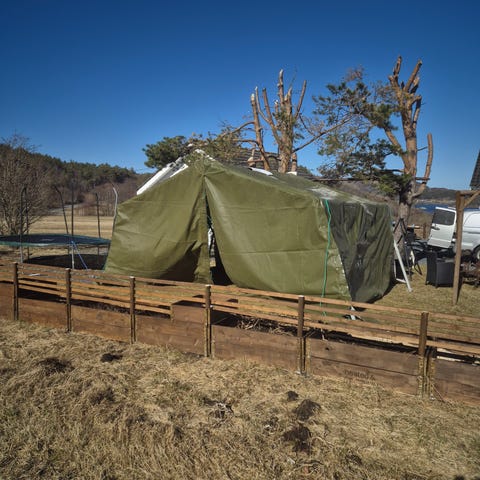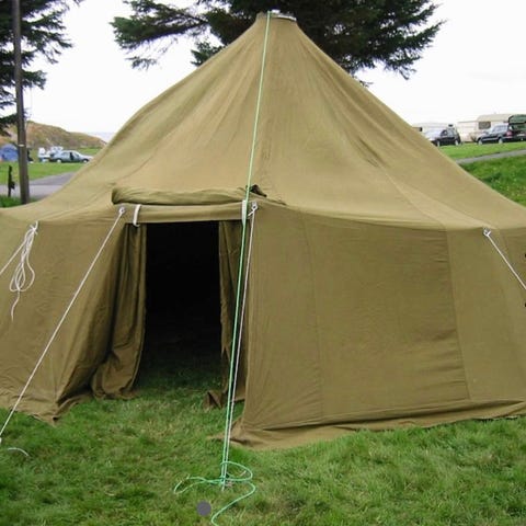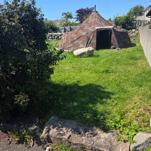 Ca.25 kvm stort militærtelt. Teltsett for 16 mann. Består av teltduk og utstyrskasse. Diameter på 6 meter. Høyde på vegg: 1,1 m. Telt høyde senter: ca.3 m. Teltduk holdes oppe av pipe med ovn. Ovn følger selvsagt med.