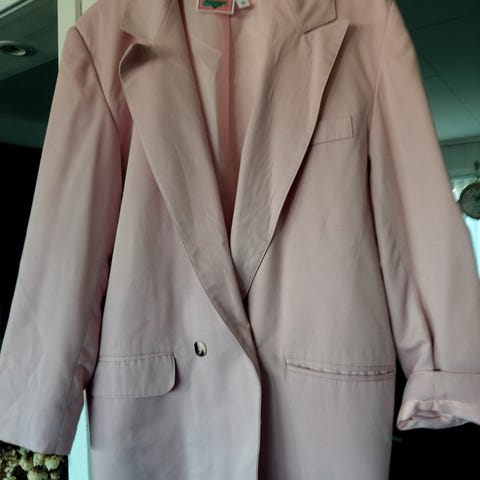 Nydelig klar rosa farge, dobbeltspent med sorte knapper. Perfekt til både hverdags, jobb og fest!
