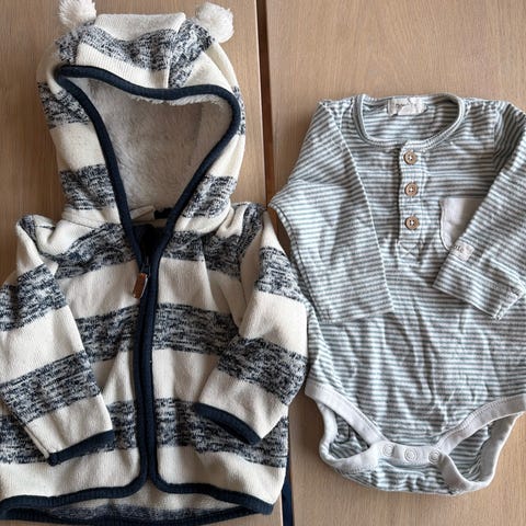 Stripet genser og mørk blå vest er str 68.