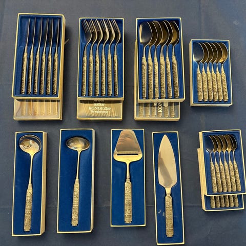 Ett av settene leveres i original eske, men plastikk i lokk mangler. Eskene er derfor litt mer medtatt en selve bestikket