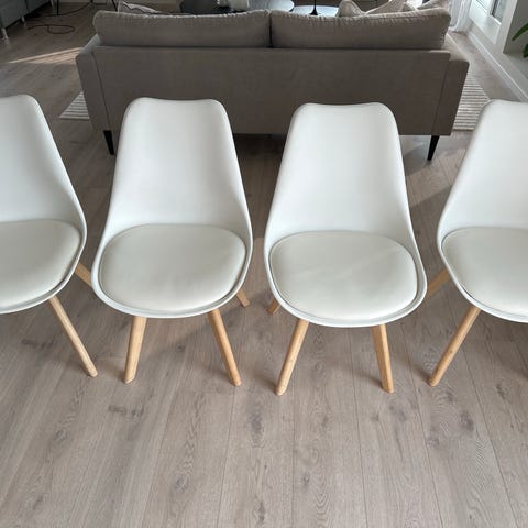 6 stoler - sete i hard plast og bein av tre. Etterlikning av de kjente Eames-stolene