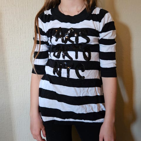 Pen hverdags Genser str 134 / 140. Hvit med svarte striper, tre kvart arm. Fin til å bruke til hverdags og sommer.