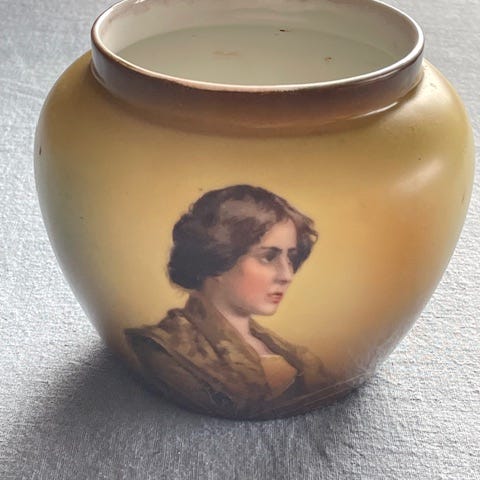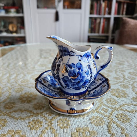 PRYDSKÅLER, trolig fra von Schierholz, Dresden, Tyskland. Trolig saltkar. I rokokkostil, tidlig 1900-tall. Håndmalt og gullstaffert stentøy.