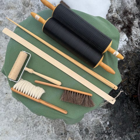 Bakerulle med pigger. Selges for 250,-. Den mangler to pigger, ellers er den strøken.