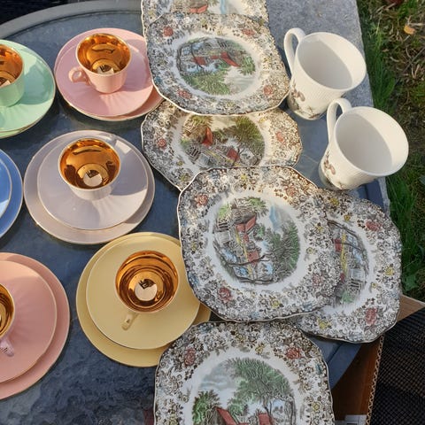 12 asjetter, diameter ca 17,5 cm. Disse er nærmest strøkne. Kr. 100 pr. fat.