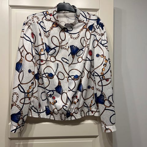 Selger en stk skjorte med annanas motiv og gull knapper.