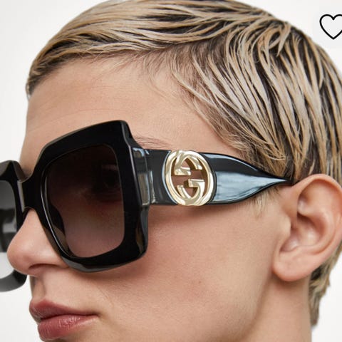 Vurderer å selge autentiske Gucci oversized solbriller – et tidløst tilbehør som kombinerer luksus og eleganse. Solbrillene har sorte, oversized innfatninger med den ikoniske store GG-logoen på stengene.