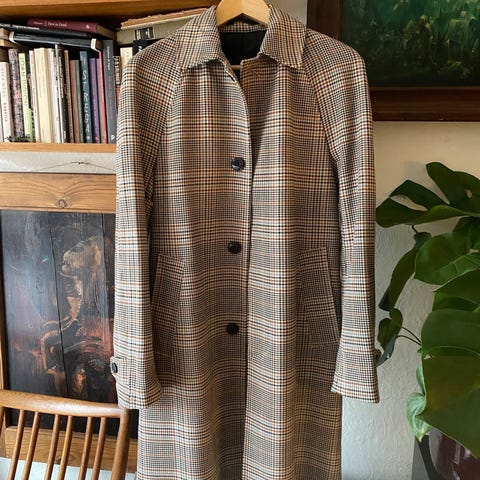 Selger en fin brun frakk, den har fått typ maling på innsiden