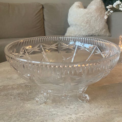 Diameteren 40cm og dybdeb 10cm. Utrolig fin stor blå skål.