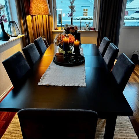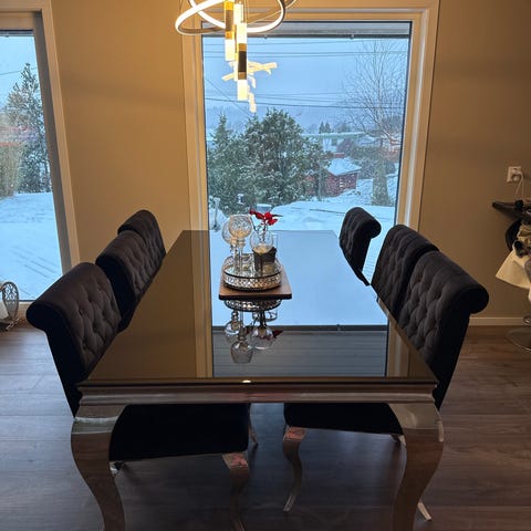 Spise bord med 6 stoler ,lampe,speil ,kommode og pynt