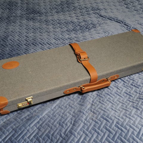 Kofferten har 2 kodelåser , felt for og sette inn navnelapp, kledd med velour stoff der hvor kolben og løpet skal ligge samt i lokk .