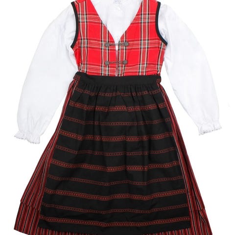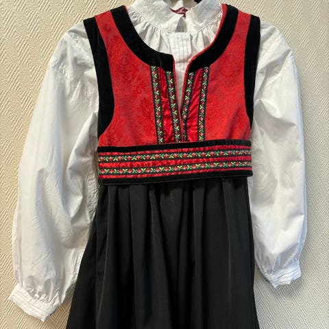 Kjøpt ny av meg, brukt en gang. Bunaden er merket str. 5 år, jeg opplever str. som romslig, sjekk gjerne ut produsentens hjemmeside for eksakte mål.