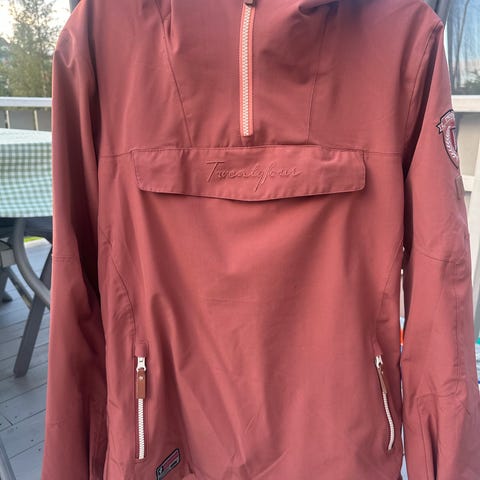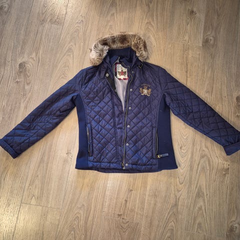 Nydelig jakke med fake pels, stor bryst lomme og en litt mindre nede på magen. Glidelås i siden