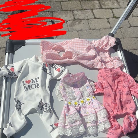 Den rosa jakken med pels kjøpte vi selv brukt, men den har aldri passet.