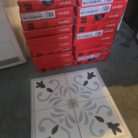 Ubrukte dekorfliser selges. Epoque blue/light grey. Flotte for mindre inngangsparti eller bad.