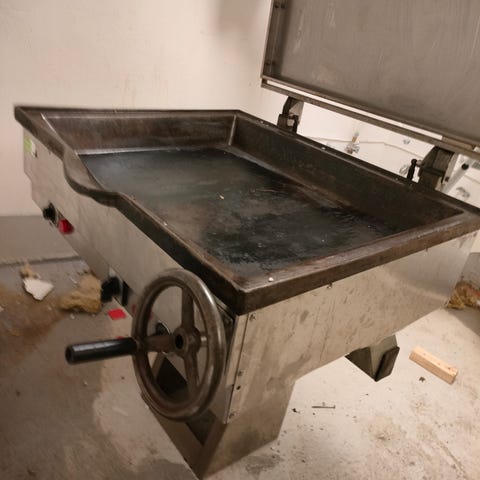 Rustfri benk m/kum /skap/skuffer.Er på hjul med brems.L 103 cm B 60cm og H 94 cm.