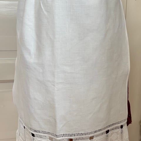 Forkle med Hardangersøm laget i lin. Håndbrodert.Pent og velholdt. Høyde 53 cm cm. Bredde 77cm. Total lengde på forkle med knytebånd. 163 cm. Ingen flekker.