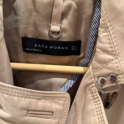 Trenchcoat i beige bomull med søte blomster broderi fra Zara, str S. Justerbart med belte i midjen og nederst på ermene. Knapt brukt, ingen slitasje.