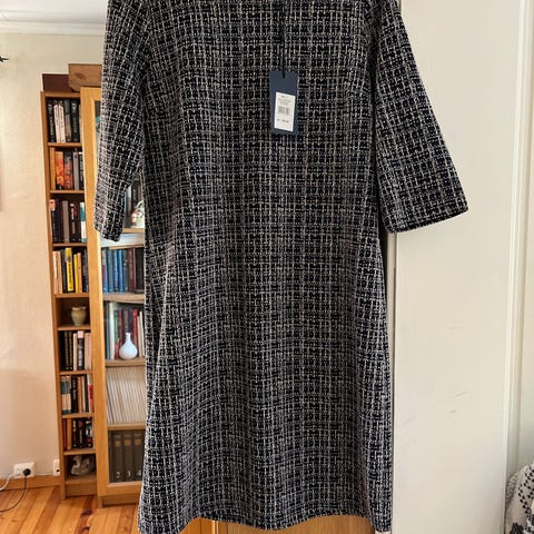 Blå kjole med trekvart lange ermer, lommer, lengde til knærne, str 40/42 vid modell og stor i størrelse.