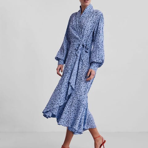 Kjolen er i en tung sateng, og henger veldig fint og flatterende på. Kjolen har fastsydde bånd, i samme stoff/print, på hver side, som kan knytes både foran og bak.
