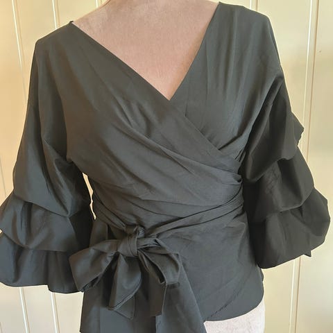 Hvit/ offwhite bluse fra Boohoo med fast omslag og 3/4 arm med volang. Str. 8= str. 36, litt liten i størrelsen. Pent brukt.