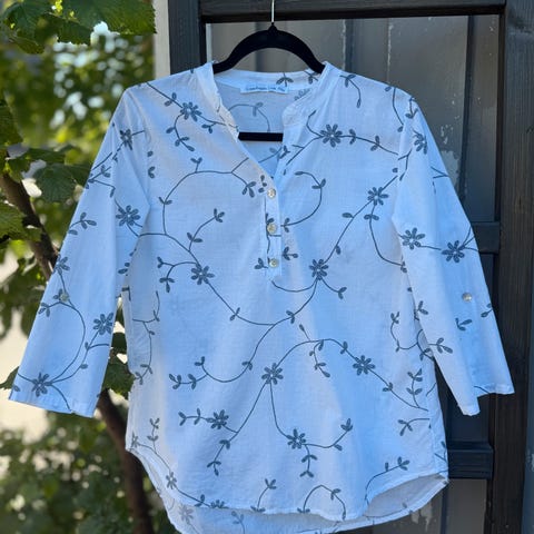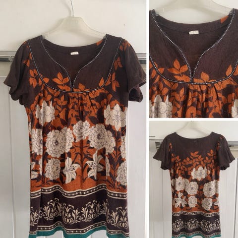 Nydelig Boho style tunika svart farge med blomsterdetaljer.100%Lin den kan lukes med glidelås til siden. Det står størrelse 44men liten i størrelse så passer best til Medium/Small.