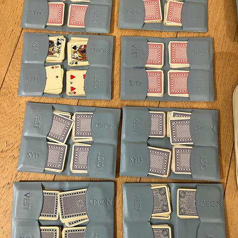 Nydelige spillekort, papirblokk for å holde orden på poeng. + to penner. Nydelig sett, inneholder alle 52 kort + 2 Joker og spilleregler x 2