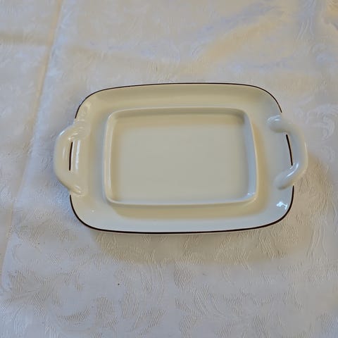 Vintage fajansefat produsert av Boch i Belgia, stemplet under bunnen. Mål ca 33,5 x 7,5 cm. Det har bruksspor som missfarging noen steder innvendig, se bilder for stand.
