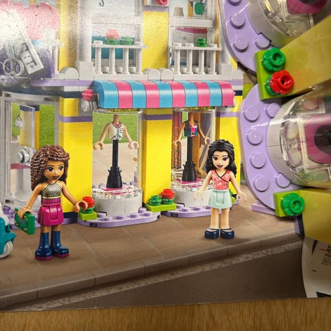 Morsomt Lego friends sett med klesbutikk/tilbehørsbutikk. Mangler én minifigur, Emma. Jeg har en annen Emma (andre klær) som kan selges med mot 20 kr tillegg i prisen. Mangler også tre klesplagg / tøybiter, jeg har lagt ved noen eksempler på hvordan man kan lage selv.