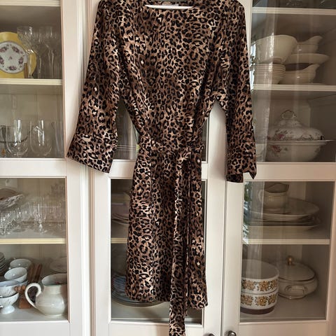 Kul kjole i leopardmønster i varme brunfarger som passer godt til alle kroppstyper og fasonger. Selges for KUN kr. 250,-