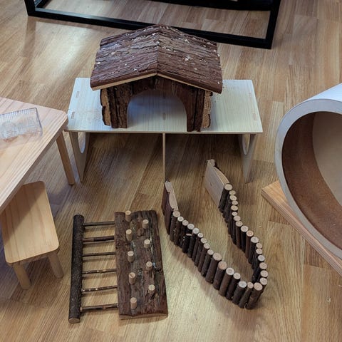Pakke med flere hus, ganger, tuneller og gjerde til hamster, mus, rotte eller andre gnagere. En koselig liten luftegård. Synlig brukt, men masse bruk igjen.