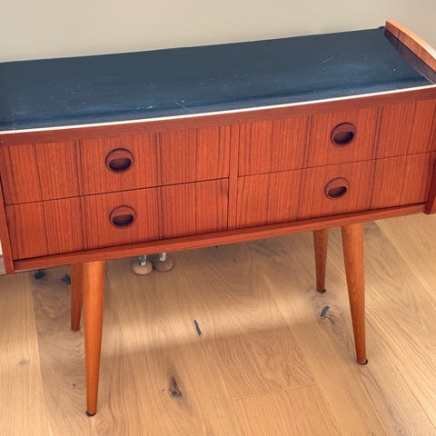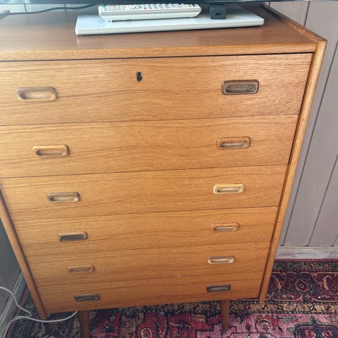 En gedigen stor flott kiste. Denne er gammel. Sprekker på lokket. Alt er heltre teak