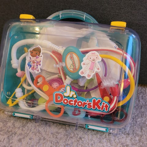 Pent brukt doktorkoffert i plast med ulikt utstyr.
