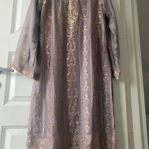 Veldig fin lys lilla farge klær. Helt nye og moderne kjøpt i 2025. Latest design. Long shirt ca 46 inch. Cut Dana shirt embroidery. Silk trouser, net dupatta. Passer en small og medium størrelse. Chest underarm til underarm 50cm.