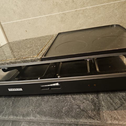 Selger denne racletten som er lite brukt. Den er litt stygg på steinen som jeg desverre ikke har klart å få bort. Den andre stekeplaten kan snus, slik at det er riller på den ene siden og sirkler på den andre siden. Den har åtte stekeskåler under.
