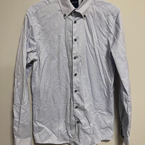 Nydelig Hugo Boss skjorte I hvit med blå striper. Størrelse Medium. Skjorten er veldig lite og pent brukt.