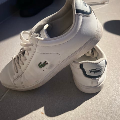 Selger sneakers fra Lacoste i vitt og blått skinn. Kun brukt få ganger. Stl 41. Må hentes på Kolbotn