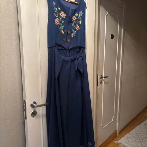 Montert til meg i 2009. Jeg er 175 cm høy og størrelse 40. Kan evt. sys om. Vesten har pr. nå 45 cm livvidde, 41cm fra skulder til liv, lengde på stakken er 97 cm. Det er noe å gå på både i vest og stakk.