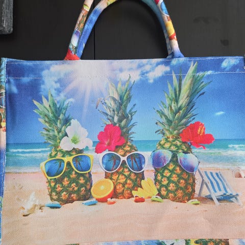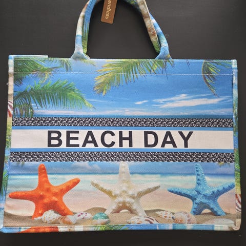 Strandveske i stoff, kr 125,-